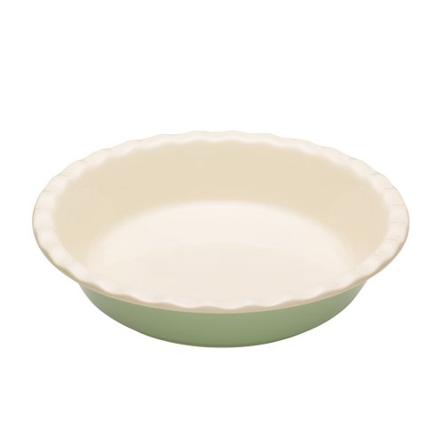 Green and cream stoneware pie dish, measuring 26cm in diameter. The pie dish is 5.7cm in depth and features fluted edges. This ceramic pie dish is oven, microwave and dishwasher safe